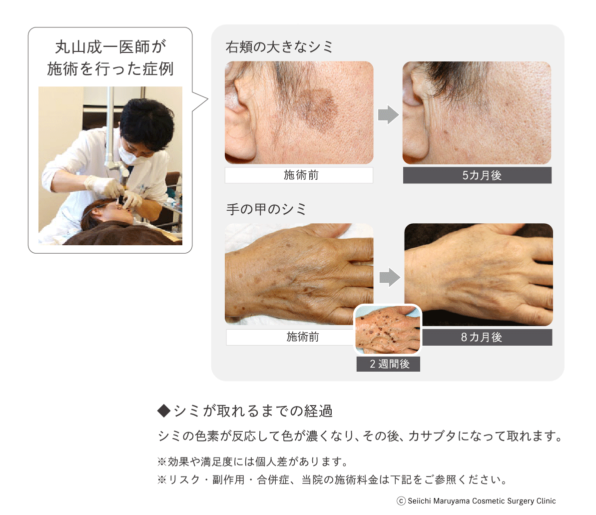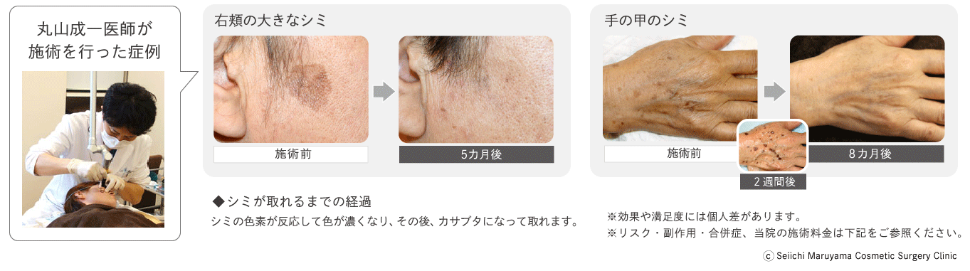 発赤、痒み、疼痛、炎症性色素沈着、色素脱失、水疱形成、火傷、瘢痕形成、ケロイド形成、自分が想定していた状態、結果、満足などと異なる可能性があります。*シミ(老人性色素斑)は1、2回で取れますが、黒子・アザは複数回(2回以上)かかる場合があります。